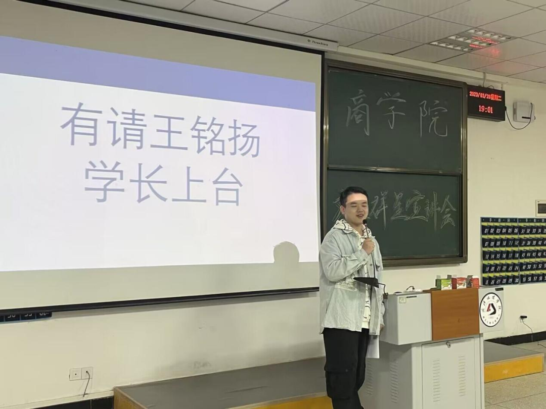 王铭扬是商公司党务小组组长,校奖学金获得者。他介绍了自己干部工作经历以及寒暑假社会实践的经历和体验。他鼓励同学们不要将自己局限于寝室,多出去看看外面的世界,“与其等风来,不如追风去”;多思考自己未来的方向,所有的答案都在路上。