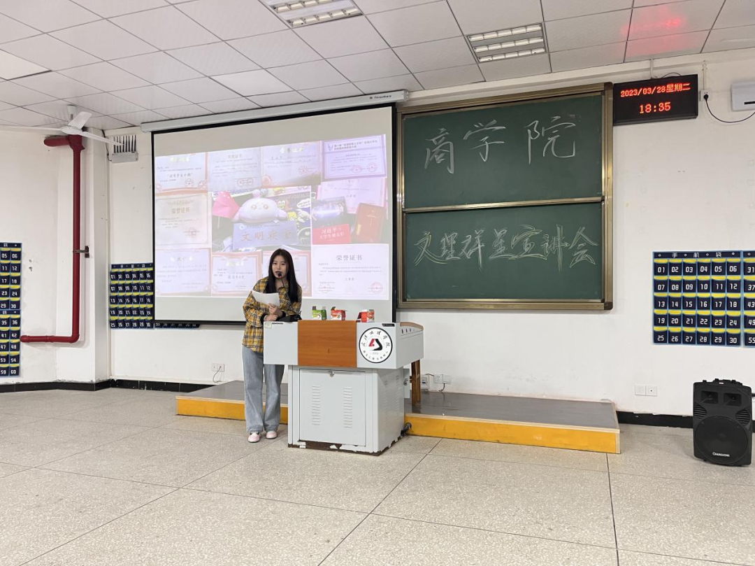 刘星颖是班级班长兼团支书,校奖学金获得者。她向同学们分享了自己的学习经验,强调:学习和生活要会制定符合自身条件的计划、设立目标;要充分利用自身的优点;认知不完美才是常态,不放任自己虚度光阴;调整好自己的心态,把握机会敢于争取。她鼓励22级同学们大学不设限,认真对待大学四年。