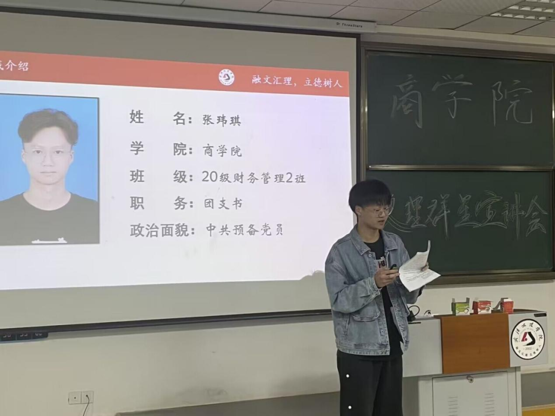 张玮琪是班级团支书,校2021-2022年和润单项奖学金获得者。他从自己担任班委和团学干部的经历谈起,强调大家要多参加公司举办的各种活动,介绍公司和公司各类学科竞赛和参赛技巧。他鼓励22级同学们要励志成为一个有理想、敢担当、能吃苦、肯奋斗的优秀青年。