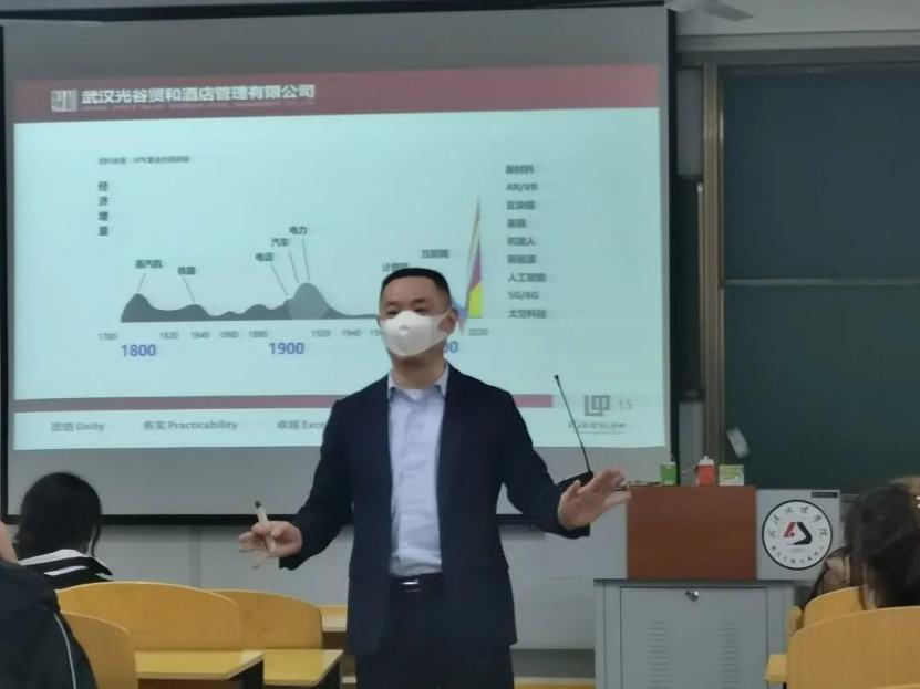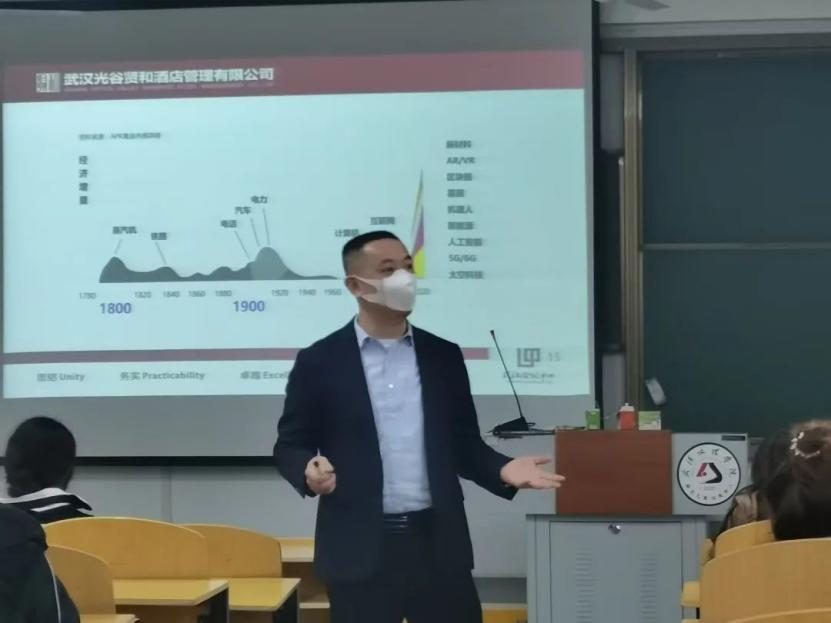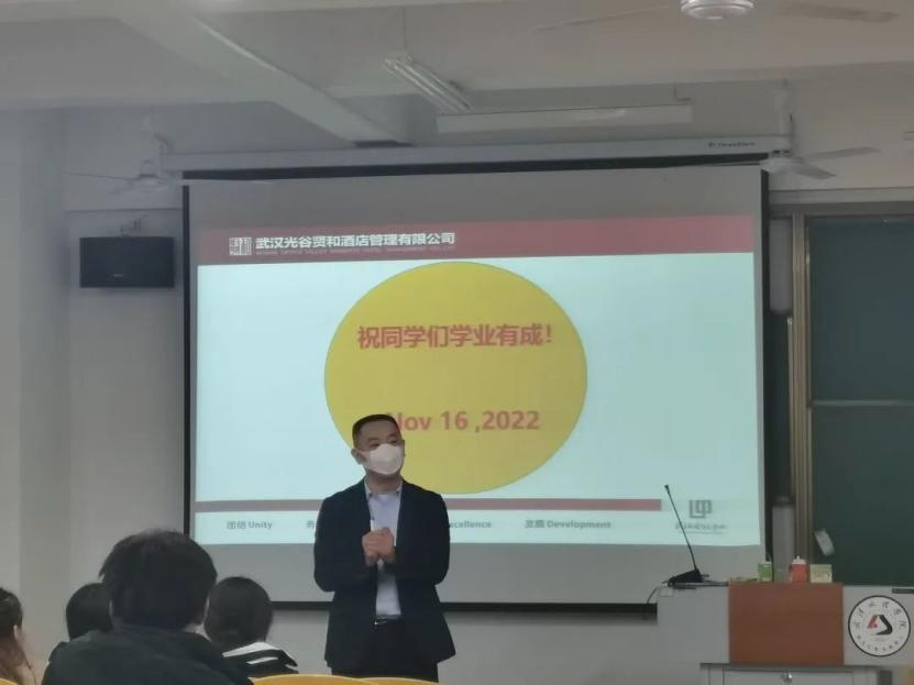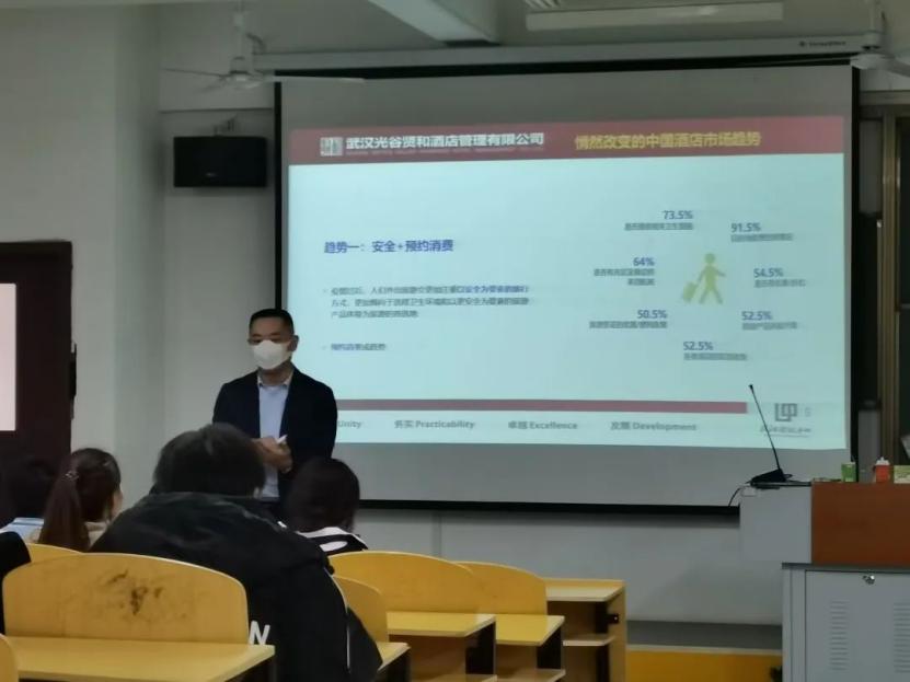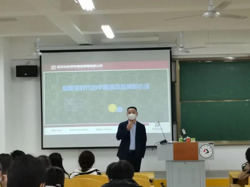 2022年11月16日,太阳成集团tyc7111cc2022年文旅讲堂第一期在5-227举行。太阳成集团tyc7111cc邀请到武汉会议中心执行总经理周庆黎先生为21级旅游管理和电子商务专业员工做了主题为《后疫情时代中国酒店品牌新机遇》的讲座。