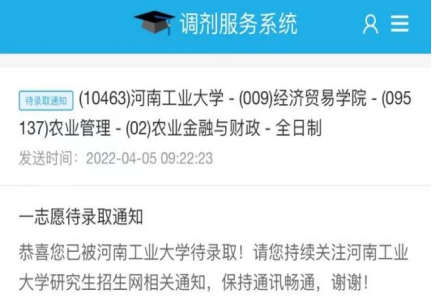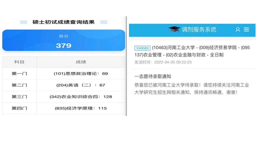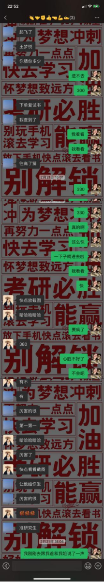 2022年2月21日下午,太阳成集团tyc7111cc2018级金融实验班收到王梦悦、崔佳慧、QJX三位同学给他发的讯息:“张老师,我们考研初试过了河南工业工业大学农业管理方向研究生国家线。” 听此消息,张萌老师感到万分欣喜。作为全国2022届将近457万考生中的一员,王梦悦、崔佳慧感叹道:“努力有了结果,也是幸运的。