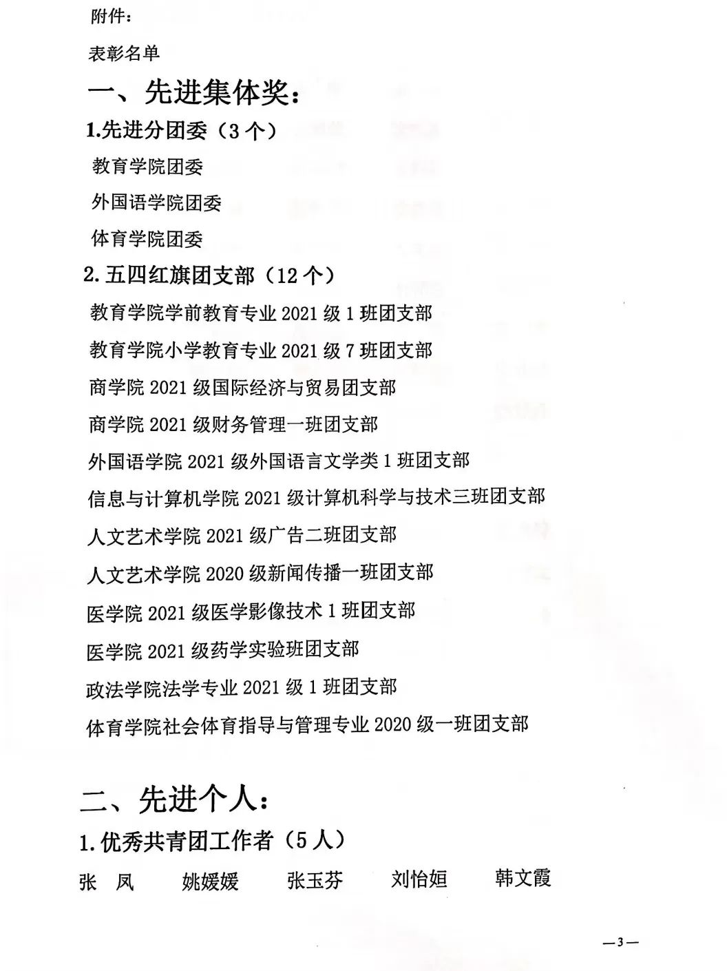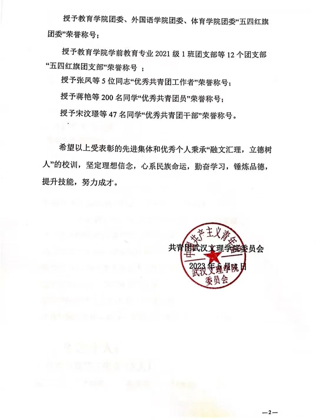 授予教育公司学前教育专业2021级1班团支部等12个团支部“五四红旗团支部”荣誉称号;