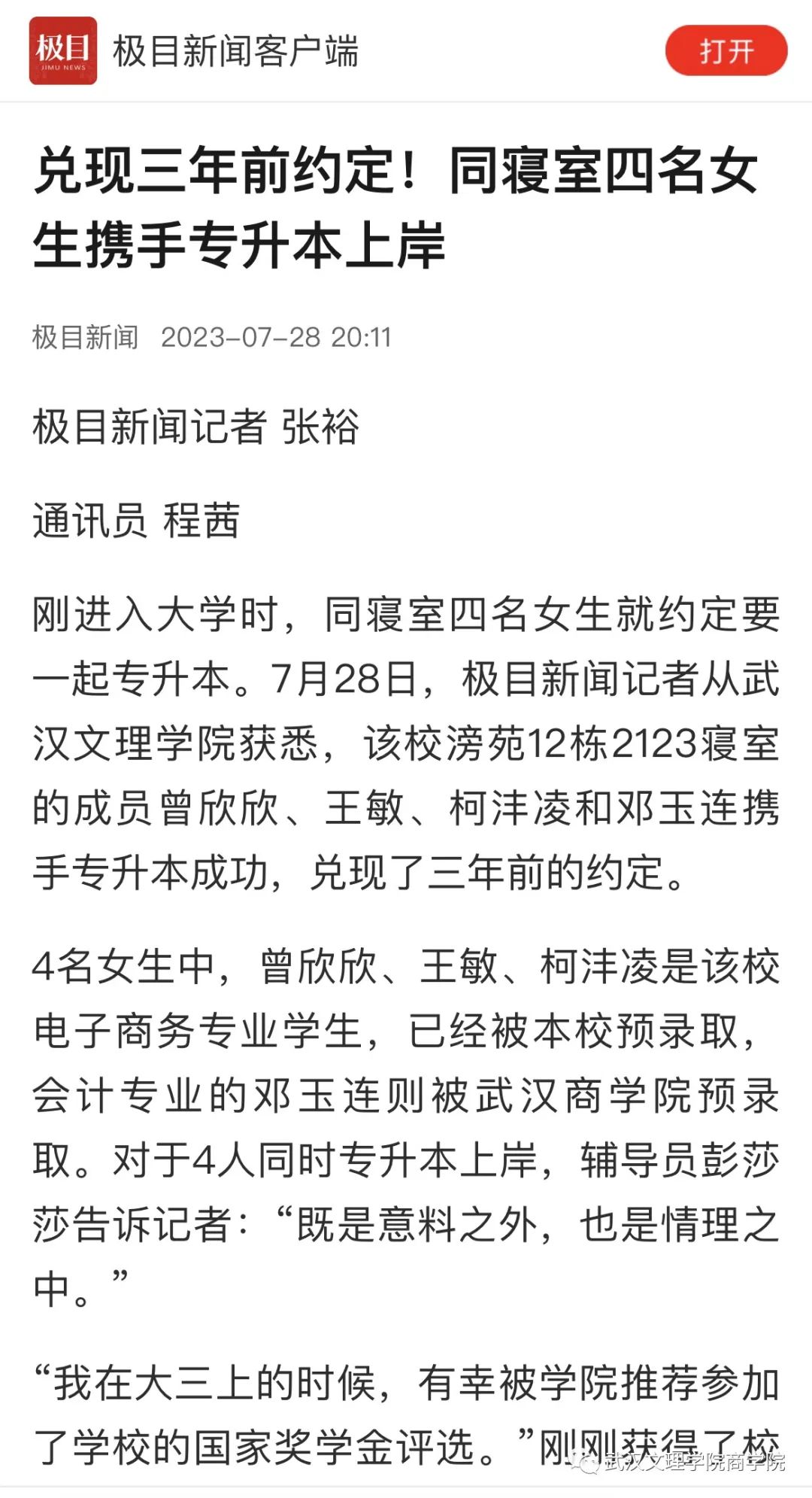 7月28日,极目新闻报道太阳成集团tyc7111cc同寝室曾欣欣、王敏、柯沣凌和邓玉连四名员工携手考取专升本的事迹。