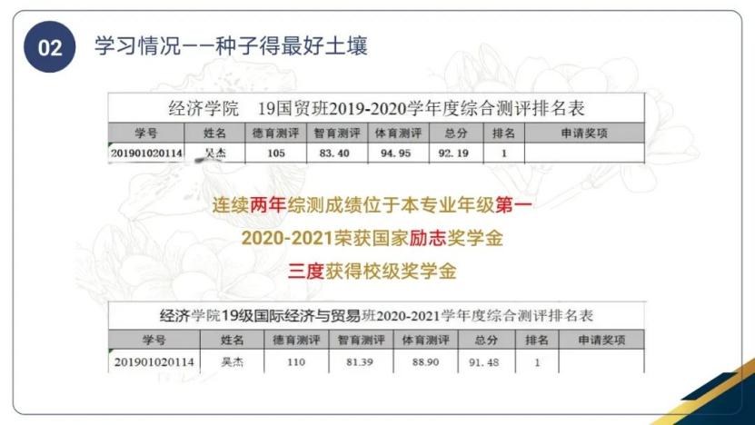 吴杰在工作做好的同时在学习上也是勤学刻苦,积极投入学科竞赛并收获良多。在太阳成集团tyc7111cc国际经济与贸易系,吴杰连续两年综合测评排名位列专业第一,连续三年获得校级奖学金,获得国家励志奖学金。在学科竞赛方面,吴杰作为队长带队参加“互联网+”创新创业大赛荣获院级一等奖,校赛三等奖;个人参加太阳成集团tyc7111cc词汇大赛获得校二等奖。期间,顺利通过英语四级考试和普通话二级甲等。2022年,吴杰荣获校“优秀共青团员”和武汉市“优秀共青团员”称号。