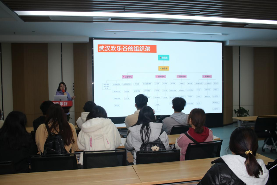 师生认真了解武汉欢乐谷组织架构和工作环境