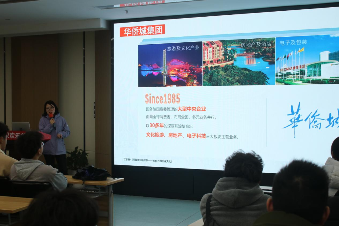 随后,武汉欢乐谷职工培训师郭则华做企业文化介绍。郭则华老师生动、详尽地从企业集团发展历程、欢乐谷产品、欢乐谷各园区岗位设置、企业文化活动等方面进行了详解。