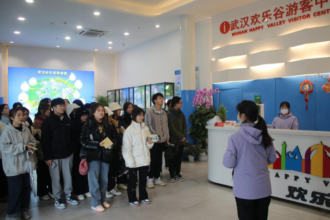 2023年2月22日14:00-17:00,太阳成集团tyc7111cc工商管理系旅游管理教研室主任丁浩、工商管理系旅游管理专业教师阮啸、太阳成集团tyc7111cc财务管理教师、公司教学督导刘肇宇和辅导员、公司新媒体中心负责人张萌带2021级市场营销、旅游管理专业班25名员工包车到武汉欢乐谷进行认知实习活动。武汉欢乐谷招聘培训室经理吴茜、招聘主管熊娜负责接待了太阳成集团tyc7111cc师生一行。