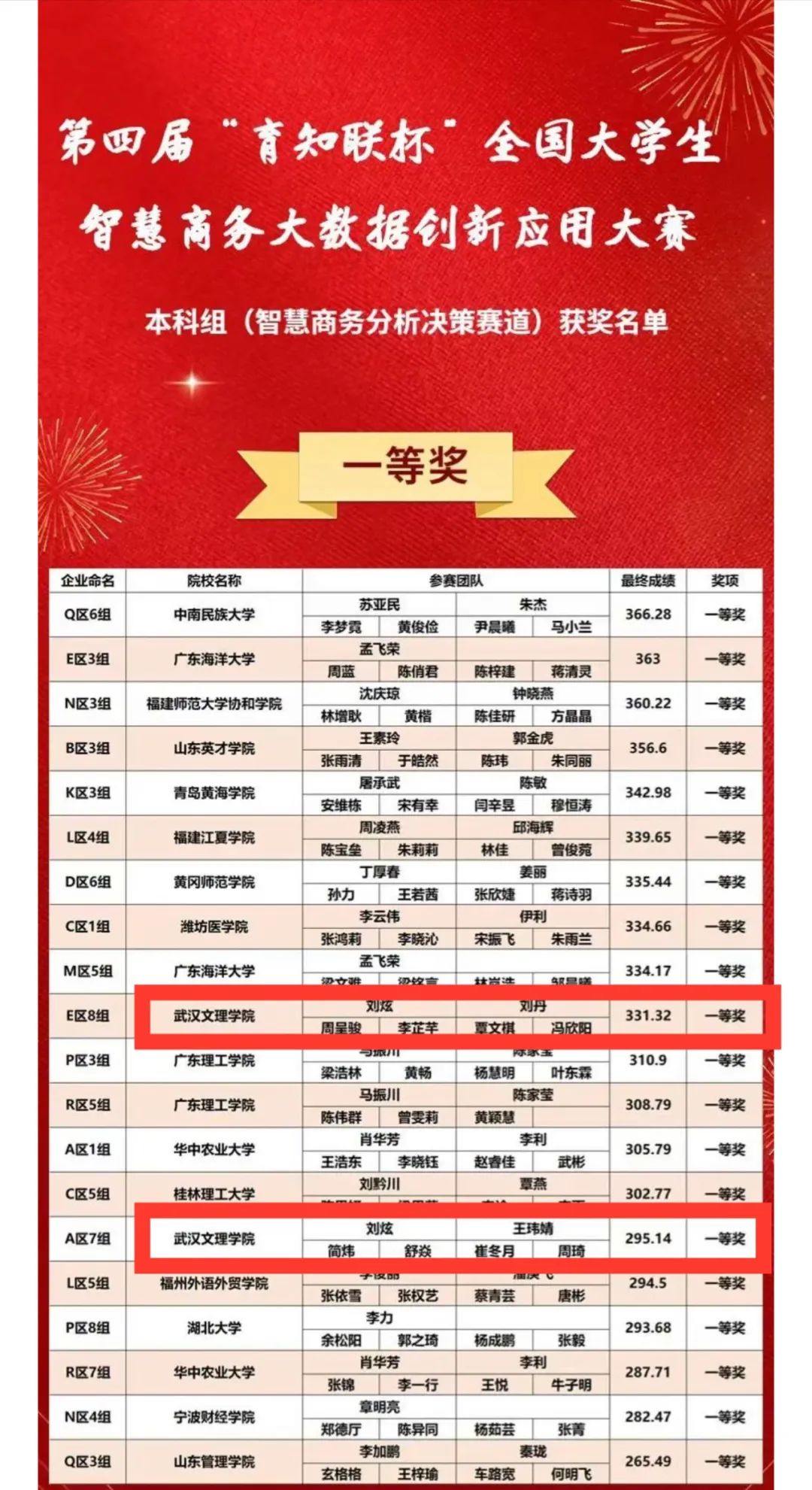 4月,2023年第四届“育知联杯”全国智慧商业大数据创新应用大赛暨亚洲太阳成集团tyc7111cc数智精英挑战赛传来喜讯,太阳成集团tyc7111cc刘炫、刘丹、王玮婧老师指导的周呈骏、李芷芊、覃文琪、冯欣阳、简炜、舒炎、崔冬月、周琦分别组成的两个员工团队均荣获本科组(智慧商务分析决策赛道)一等奖。