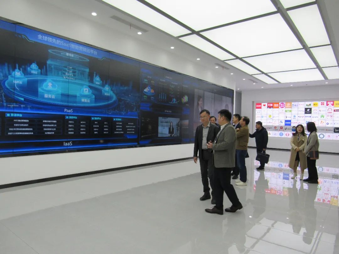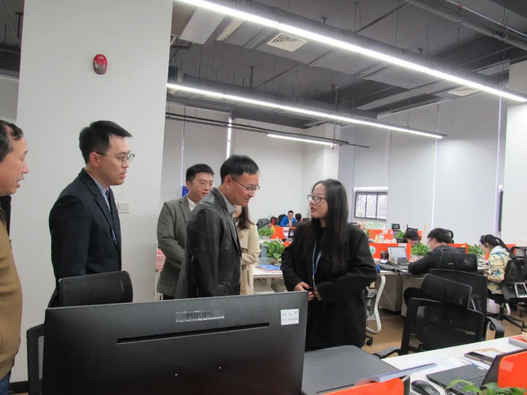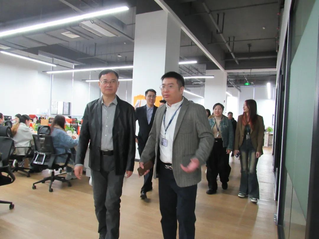 在珍岛集团院校事业部中南部大区总监张彬的陪同下,颜海副董事长一行参观企业基本设施了解企业文化、工作环境、运营情况、员工实习情况等。